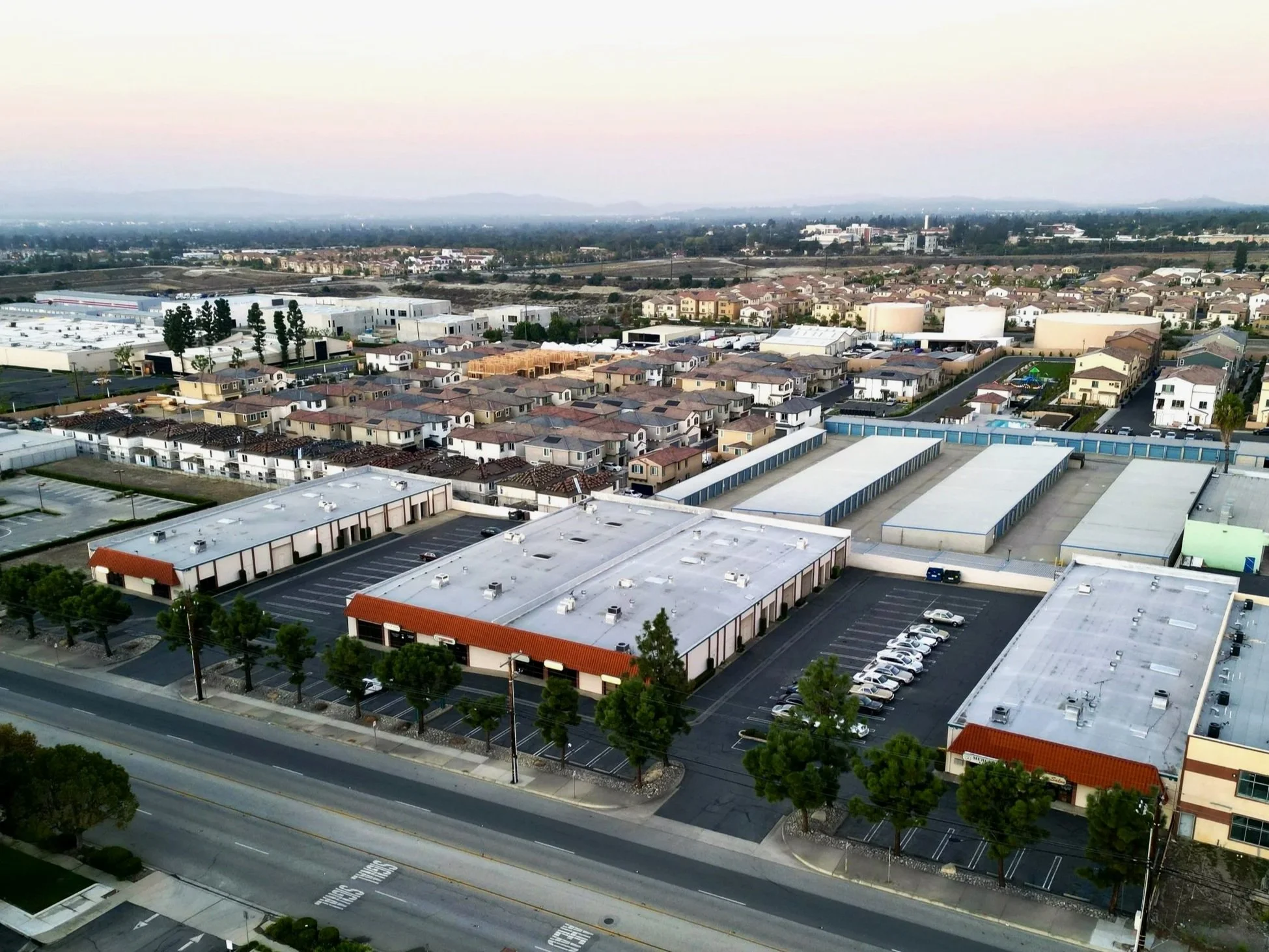 Aerial view of Central Park, a 24-unit mixed-use small-bay industrial property in Upland, California.